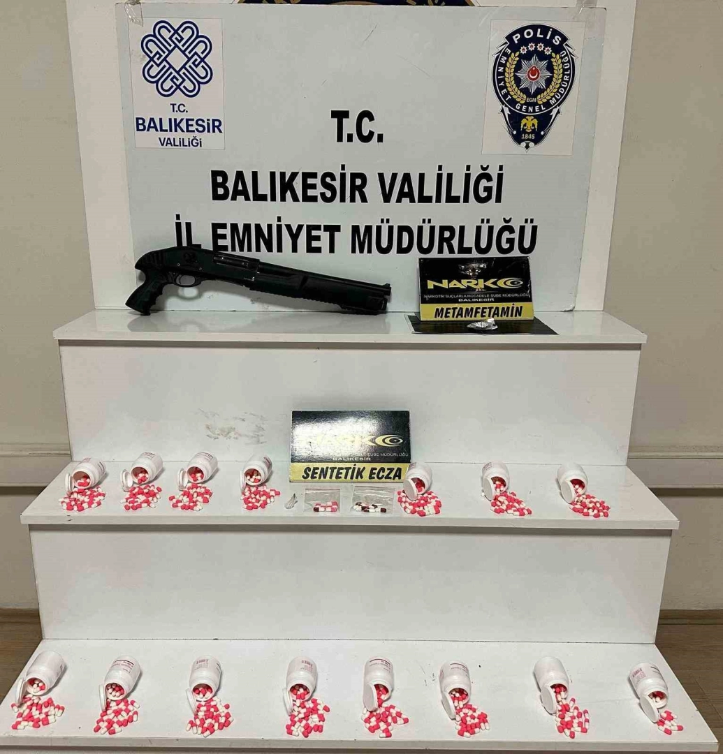 Balıkesir’de narkotik polisinin düzenlediği operasyonda 883 adet sentetik ecza hapı, 0,37 gram metamfetamin ve 1 ruhsatsız av tüfeği ele geçirildi.