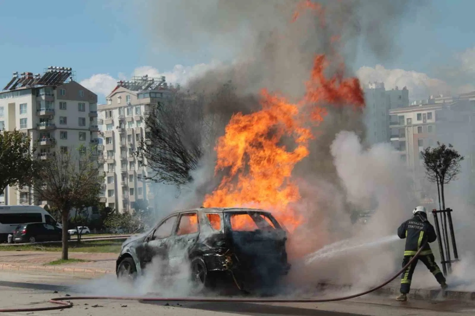 Antalya’nın Konyaaltı ilçesinde seyir halindeki otomobil alevlere teslim oldu. Dumanları fark eden sürücü, otomobildeki kedisini de alarak son anda araçtan dışarı çıktı. Oldukça korktuğu gözlenen kedi, sahibinin omuzundan bir an olsun ayrılmadı. Olay, saat 11.00 sıralarında Konyaaltı ilçesi Çamlık Caddesi üzerinde meydana geldi. Edinilen bilgiye göre, 07 SG 189 plakalı Mercedes marka otomobilliyle seyreden sürücü Salih Türk (55), arka taraftan dumanların çıktığını fark edince aracı yol kenarına park etti. Türk, içerisini dumanların kapladığı otomobilden veterinere kontrole götürdüğü kedisini de alarak kendini dışarı attı. Alevler bir anda aracı kapladı. Araç sahibi ve çevredeki vatandaşların yangın tüpleri ile müdahalesi alevleri sönürmeye yeterli olmadı. İhbar üzerine adrese Antalya Büyükşehir Belediyesi İtfaiye Daire Başkanlığı ekipleri sevk edildi. Kısa sürede adrese gelen ekipler alev topuna dönen araca müdahale etti. Ekiplerin yaklaşık yarım saatlik müdahalesi ile yangın tamamen söndürülürken otomobil ise tamamen kullanılamaz hale geldi. Sahibinin omuzundan bir an olsun ayrılmadı Yaşananlar nedeniyle oldukça korktuğu gözlenen kedi ise, sahibinin omuzundan bir an olsun ayrılmadı. Dumanları fark edince aracı hemen park ettiğini belirten Salih Türk, "Seyir halindeyken arka taraftan birden dumanlar çıkmaya başladı. Durdum, kutup başını çıkardım. Duman hala devam ediyordu. Yangın söndürücüyü çıkartamadım zaten dumandan" dedi.