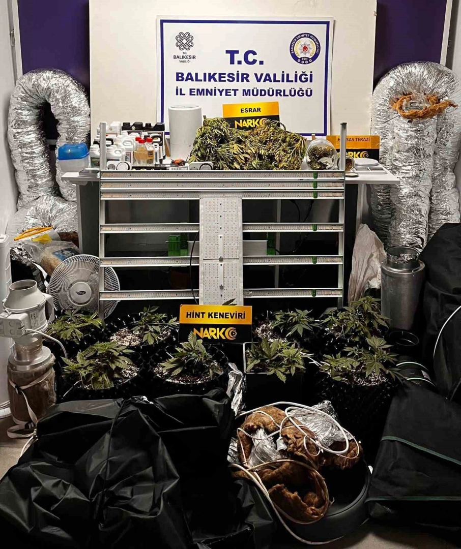 Yapılan operasyonda; 2 kilo 488 gram esrar (skunk) maddesi, boyları 20 ila 30 cm arasında değişen saksıda ekili 9 kök Hint keneviri, 1 adet çalışır durumda hassas terazi, 1 adet esrar öğütme aparatı, led panel iklimlendirme cihazının yanı sıra çadır ve ekipmanlar, uyuşturucu madde kurutmasında kullanılan 2 parça halinde tel askı, çeşitli ebatlarda Hint keneviri ekmek için kullanılacak boş saksılar, havalandırma boruları, su terazileri, karbon filtre torbaları, rutubet ve oda nemlendirici giderici materyaller, zaman ayarlı prizler, vantilatörlerle uyuşturucu madde üretiminde kullanılan çeşitli miktarlarda bitki topraklarıyla ekipmanlar ele geçirildi.