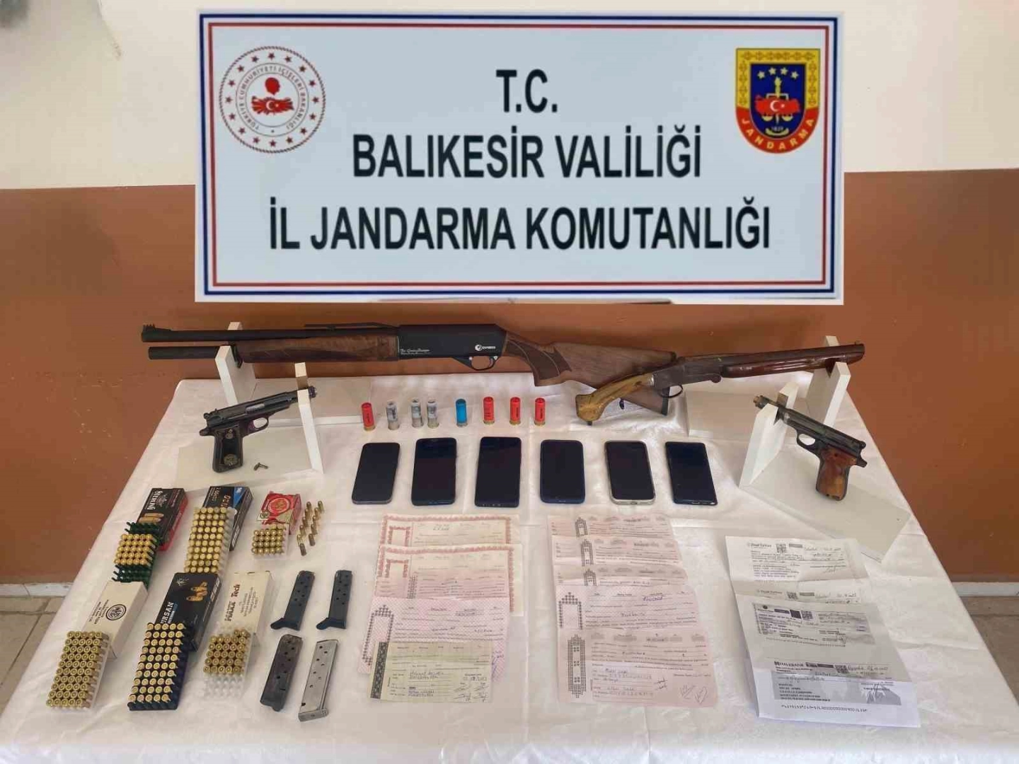 Şüphelilerin yakalanması ve suça ilişkin delillerin toplanması amacıyla Gömeç, Burhaniye ve Ayvalık ilçelerinde 5 şüpheliye ait 7 adreste icra edilen operasyonda; 2 adet tabanca, 2 adet av tüfeği, 213 adet tabanca fişeği, 4 adet tabanca şarjörü, 10 adet açık senet, 14 adet açık çek, 6 adet cep telefonu, 1 adet ev satış sözleşmesi ele geçirildi.