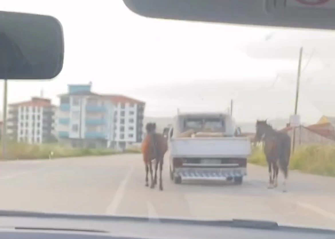 Olay Bursa-Yenişehir Yolu’nda meydana geldi. Kasalı aracıyla aracıyla yola çıkan bir sürücü, 2 atı iple kamyonetin arkasına bağladı. Direksiyon başına geçen sürücü atları trafikte dakikalarca koşturdu. O anları gören vatandaşlar sürücüye tepki gösterdi.
