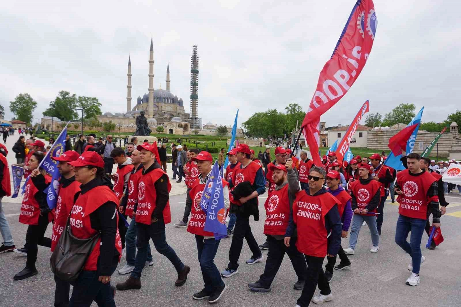 Edirne’de 1 Mayıs Emek ve Dayanışma Günü etkinlikleri çerçevesinde çeşitli sendikalar, siyasi parti ve sivil toplum kuruluşları temsilcileri, Şükrüpaşa İlköğretim Okulu önünde toplanarak, davul ve zurna eşliğinde oluşturulan kortejle trafiğe kapalı Saraçlar Caddesi’nde hazırlanan platforma yürüdü.