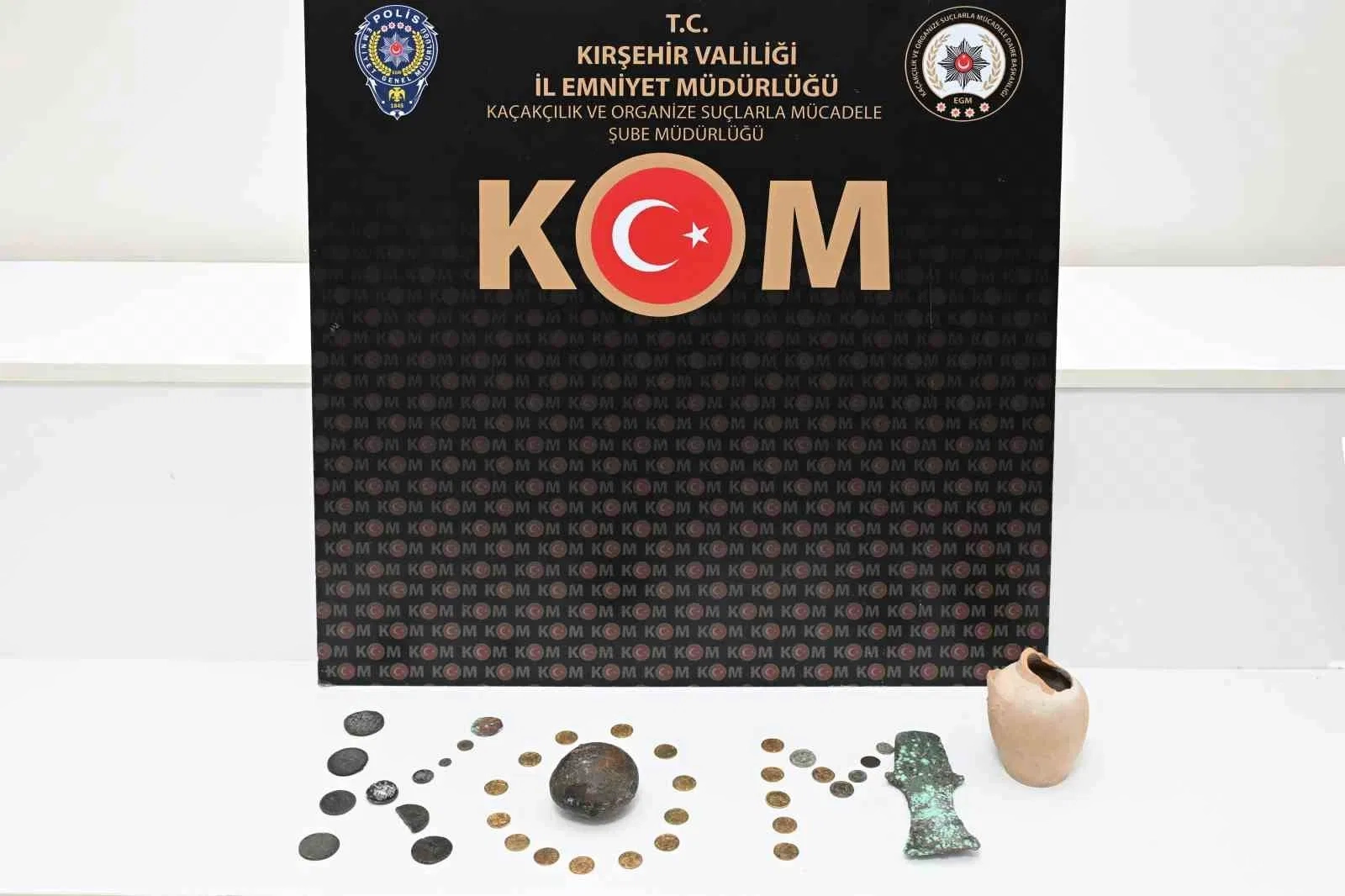 Kırşehir Emniyet Müdürlüğü tarafından tarihi ve kültürel değerlerin korunmasına yönelik yürütülen çalışmalar kapsamında düzenlenen operasyonda 38 parça tarihi eser ele geçirildi. Edinilen bilgiye göre, tarihi eser niteliğinde objeleri bulundurduğu ve satışa sunmaya çalıştığı tespit edilen O.G.’nin ikametinde arama yapıldı. Yapılan aramada; 19 Helenistik, Roma ve Doğu Roma dönemlerine ait olduğu değerlendirilen altın sikke, 16 Arkaik (Antik Yunan) döneme ait sikke ile 3 Selçuklu dönemi obje olmak üzere toplam 38 parça tarihi eser ele geçirildi. Tarihi eser kaçakçılığı suçundan O.G. hakkında adli işlem başlatıldı.
