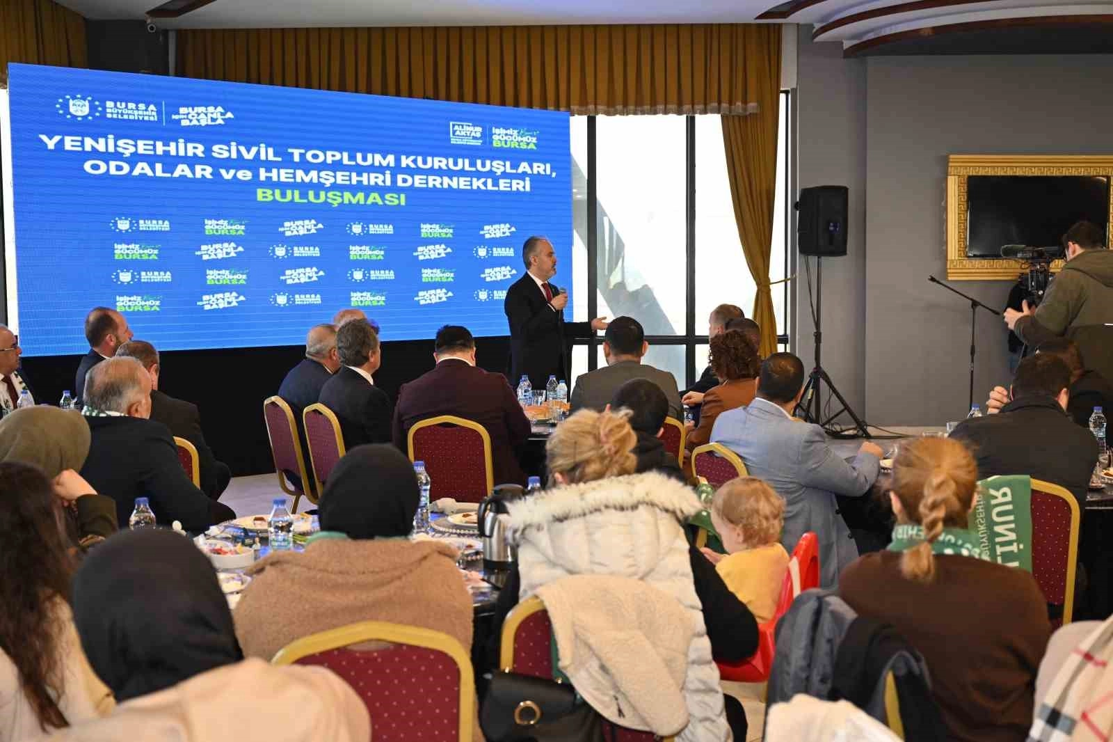 Bursa Büyükşehir Belediye Başkanı Alinur Aktaş, Yenişehir ilçesinde sivil toplum kuruluşları, meslek odaları, hemşehri dernekleri temsilcileri ve muhtarlar biraraya geldi. İmren Izgara Düğün Salonu’ndaki toplantıya, Başkan Alinur Aktaş’ın yanı sıra Yenişehir Belediye Başkanı Davut Aydın, AK Parti İlçe Başkanı Mehmet İleri, MHP İlçe Başkanı Arif Eren, Yenişehir Belediyesi eski Başkanı Süleyman Çelik, siyasi parti temsilcileri ve meclis üyeleri de katıldı.