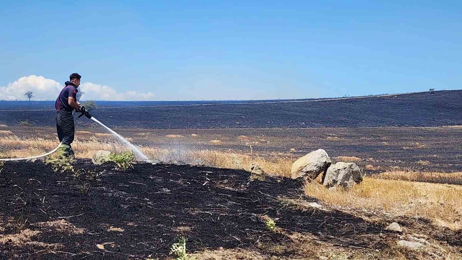 Yangın rüzgarın etkisiyle kısa sürede geniş bir alana yayılırken, bölgede yaşayan vatandaşlar da traktörleriyle yangının önünü kesmek amacıyla tarlaları sürerek müdahaleye etti.