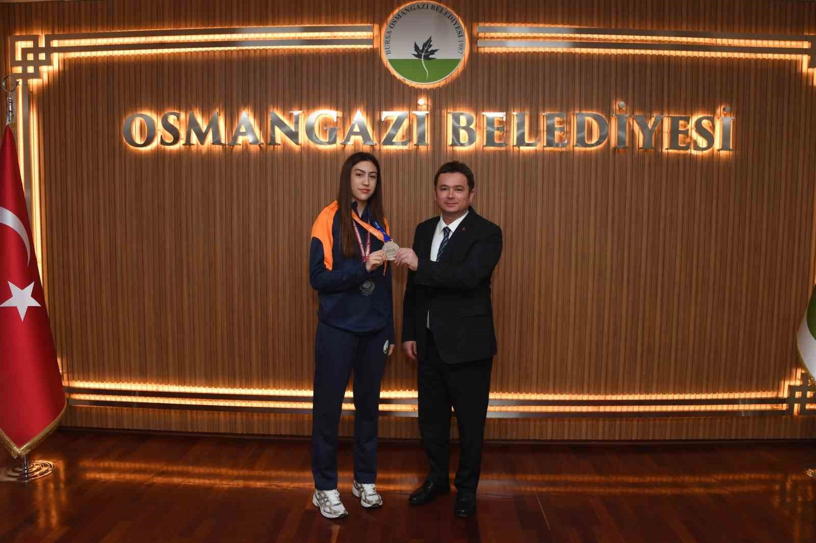 Osmangazi Belediye Başkanı Erkan Aydın, Bursa’ya büyük başarılarla dönen sporcuları, Osmangazi Belediyespor Kulübü Başkanı Fatih Karayılan ve antrenörleriyle birlikte makamında ağırlayıp tebrik ederek çeşitli hediyeler verdi.