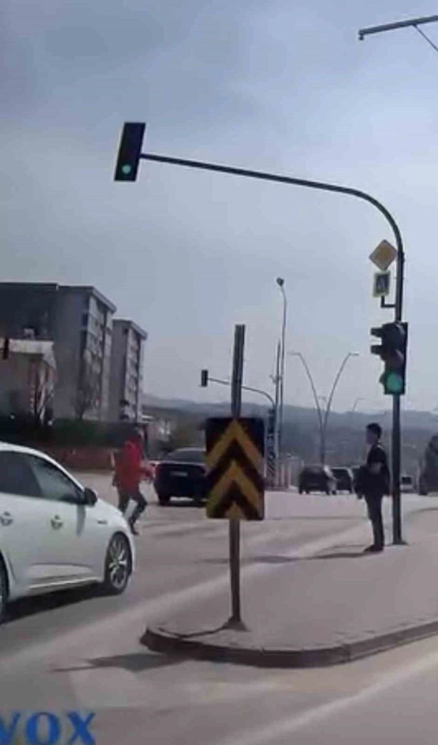 Bursa’nın Nilüfer ilçesinde trafik ışıklarının araçlara yeşil yandığı sırada karşıya geçmek isteyen bir yaya, akan trafiğe aldırış etmeden yola çıktı. O esnada seyir halinde olan bir otomobil, aniden önüne çıkan yayaya çarpmamak için manevra yaptı.