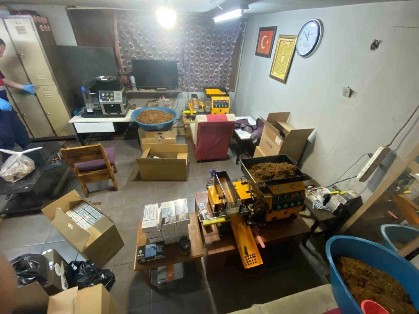 Yapılan operasyonda 80 bin adet tütün basılı sigara, 301 bin 400 adet makaron, 173 kilogram kıyılmış tütün, 47 bin 400 adet boş sigara kutusu, 4 bin 800 adet sigara filtresi, 10 adet elektronik sigara basma makinesi, 4 adet kompresör ve 2 adet hava makinesi ele geçirildi.