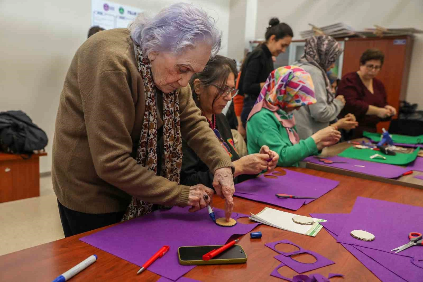 Bursa Kent Konseyi Kadın Meclisi’nde gerçekleştirilen atölye çalışmasında, keçe kumaşlar, renkli iplikler, düğmeler ve süsleme malzemeleri kullanılarak birbirinden renkli ürünler hazırlandı. Kadınların dayanışma ve ortak üretim gücünü bir kez daha ortaya koyan ürünler, 8 Mart Pazar günü yapılacak yürüyüşte kullanılacak.