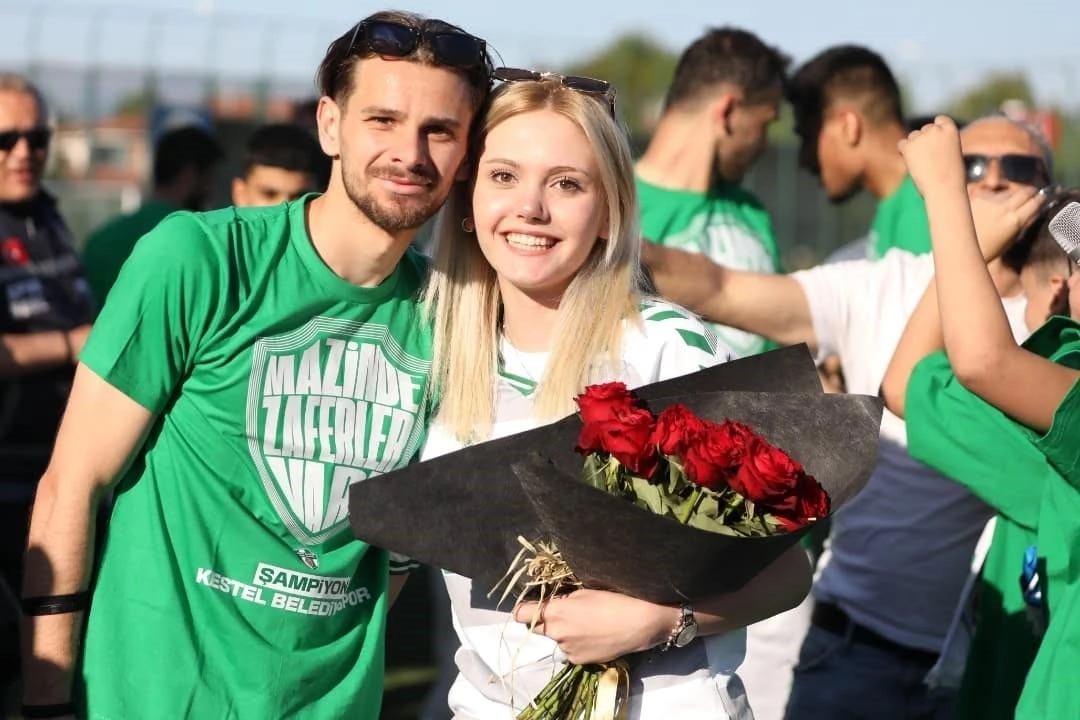 Kestel Belediyespor geçtiğimiz pazar günü Atıcılar Veysel Karani Sahası’nda oynanan Küplüpınar Yeşildağspor karşılaşmasını 3-0 kazanarak adını Bölgesel Amatör Lig’e (BAL) yazdırdı. Kestel Belediyespor forması giyen 24 yaşındaki tecrübeli kanat oyuncusu Hafız Görkem Vardar, maçın bitiminde kız arkadaşına sahada evlenme teklifinde bulundu. Evet cevabının ardından takım arkadaşları tarafından alkışlarla tebrik edilen genç çift, evlilik yolunda ilk adımı yeşil sahalarda atmış oldu.
