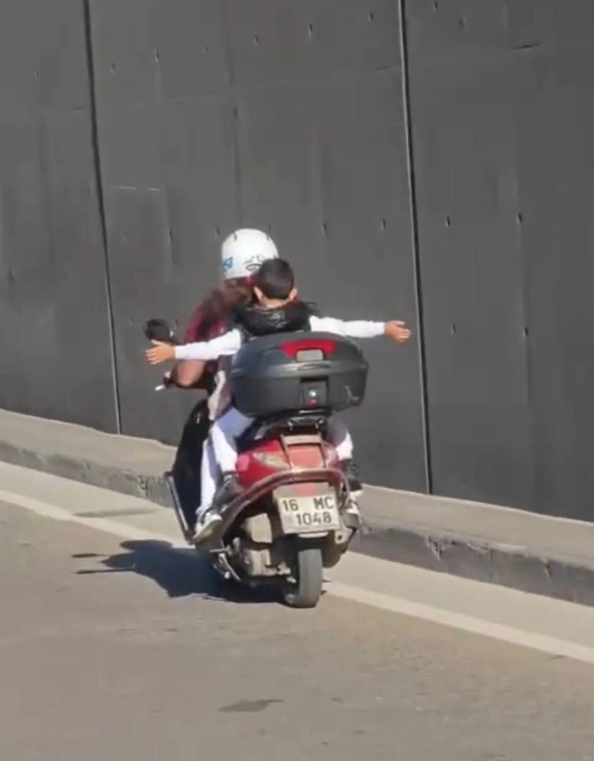 Olay, Yıldırım ilçesi Erikli mevki Ankara Yolu Caddesi üzerinde meydana geldi. Edinilen bilgiye göre, trafiğe çıkan adam, arkasına herhangi bir ekipman bulundurmadan aldığı iki çocukla trafiğe çıktı. Sürücü seyir halindeyken, arkasındaki çocuklar ise bulunduğu durumu oyuna çevirip ellerini açarak yolculuk etti. Tehlikeli yolculuk kilometrelerce sürerken, o anlar trafikteki başka sürücülerin kamerasına yansıdı.
