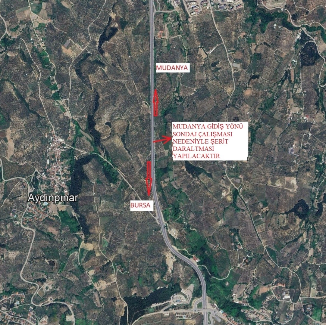 "Bursa Büyükşehir Belediyesi Ulaşım Dairesi Başkanlığı tarafından yürütülen, Bursa- Mudanya Karayolu altyapısının iyileştirilmesi çalışmaları kapsamında Deprem ve Zemin İnceleme Şube Müdürlüğü tarafından yapılacak zemin etüdü ve sondaj çalışmaları nedeniyle 27 Mayıs 2025 ile 20 Haziran 2025 tarihleri arasında Bursa-Mudanya Karayolu Aydınpınar mevkiinde ve Mudanya gidiş yönünde yolun en sağ şeridinde daraltma yapılacaktır. Bursa Mudanya Karayolundaki çalışmalar süresince, araç sürücülerinin hız limitlerine uyarak kontrollü seyir etmeleri, çalışma yapılan güzergahlarda dikkatli ve duyarlı olunması, trafik işaret ve işaretçilerine uymalarını ve trafiğin yoğun olduğu saatlerde alternatif güzergahları kullanmaları gerekmektedir."