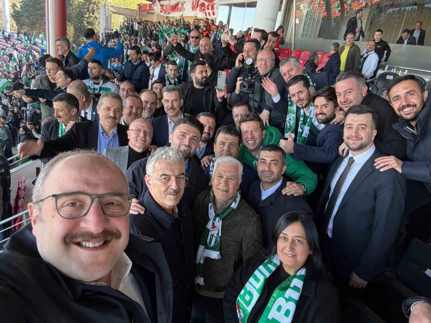 TFF 3. Lig 1. Grup 28. haftasında Bursaspor-Artvin Hopaspor maçını izlemeye giden Bursa protokolü birlikte fotoğraf çekildi. Mustafa Varank’ın yaptığı selfie ile iktidar ve muhalefet temsilcileri fotoğraf karesinde bir araya geldi. Bursa Valisi Erol Ayyıldız, Bursa Büyükşehir Belediye Başkanı Mustafa Bozbey, AK Parti Bursa İl Başkanı Davut Gürkan, TBMM Sanayi, Ticaret, Enerji, Tabii Kaynaklar, Bilgi ve Teknoloji Komisyonu Başkanı ve AK Parti Bursa Milletvekili Mustafa Varank, AK Parti Artvin Milletvekili Faruk Çelik, AK Parti Bursa Milletvekili Mustafa Esgin, AK Parti Bursa Milletvekili Refik Özen, AK Parti Bursa Milletvekili Emel Gözükara Durmaz, CHP Bursa Milletvekili Hasan Öztürk, İYİ Parti Bursa Milletvekili Selçuk Türkoğlu, Bursaspor Kulübü Başkanı Enes Çelik ve AK Parti Osmangazi İlçe Başkanı Adnan Kurtuluş, Bursaspor’un şampiyon olmasıyla o anı ölümsüzleştirdi.