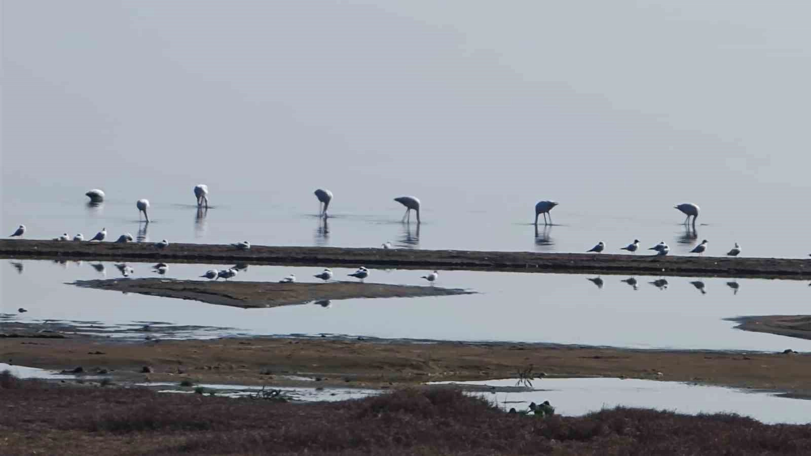 Pembe ve beyaz renkleriyle göl kenarında eşsiz bir manzara oluşturan flamingolar, doğa tutkunlarının ilgisini çekti.