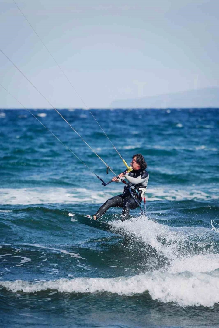 Dev dalgalara ve rüzgara meydan okuyan sporcular adeta denizde dans ediyor.