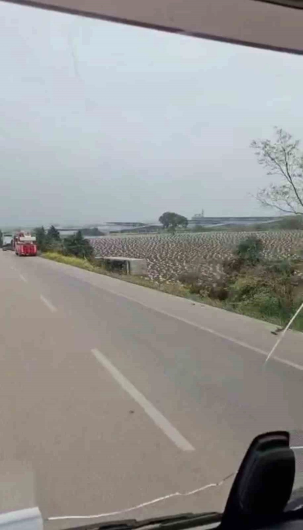 Kaza, Bursa-Balıkesir Yolu üzerinde Karacabey mevkiinde meydana geldi. Sürücüsü ve plakası henüz öğrenilemeyen tır, sürücüsünün kontrolünden çıkarak yol kenarında bulunan tarlaya uçtu. Yaşanan kazayı gören vatandaşlar durumu 112 Acil Servis Hattı’na bildirdi. İhbar üzerine olay yerine ekipler sevk edildi. Tarlaya uçan tır, vinç yardımıyla çıkarıldı.