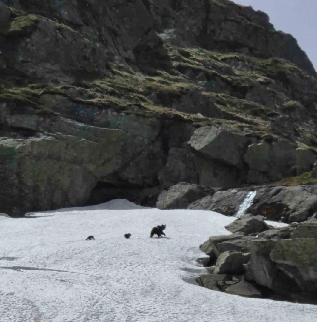 Mevsimlerin kayması sebebiyle havaların geç ısındığı hatta karın hala erimediği zirvede kış uykusunu tamamlayıp kaldıkları mağaradan çıkan anne ayı ve 2 yavrusu yiyecek ararken görüntülendi. Ayı ailesi bir süre sonra gözden kayboldu.