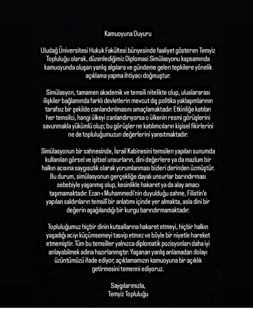 "Uludağ Üniversitesi Hukuk Fakültesi bünyesinde faaliyet gösteren Temyiz Topluluğu olarak, düzenlediğimiz Diplomasi Simülasyonu kapsamında kamuoyunda oluşan yanlış algılara ve gündeme gelen tepkilere yönelik açıklama yapma ihtiyacı doğmuştur. Simülasyon, tamamen akademik ve temsili nitelikte olup, uluslararası ilişkiler çerçevesinde farklı devletlerin mevcut dış politika yaklaşımlarının tarafsız bir şekilde canlandırılmasını amaçlamaktadır. Etkinliğe katılan her temsilci, hangi ülkeyi canlandırıyorsa o ülkenin resmi görüşlerini savunmakla yükümlü olup; bu görüşler ne katılımcıların kişisel fikirlerini ne de topluluğumuzun değerlerini yansıtmaktadır. Simülasyonun bir sahnesinde, İsrail Kabinesini temsilen yapılan sunumda kullanılan görsel ve işitmeyle ilgili unsurların, dini değerlere ya da mazlum bir halkın acısına saygısızlık olarak yorumlanması bizleri derinden üzmüştür. Bu durum, simülasyonun gerçekliğe dayalı unsurlar barındırması sebebiyle yaşanmış olup, kesinlikle hakaret ya da alay amacı taşımamaktadır. Ezan-i Muhammedi’nin duyulduğu sahne, Filistin’e yapılan saldırıların temsili bir anlatımı içinde yer almakta, asla dini bir değerin aşağılandığı bir kurgu barındırmamaktadır. Topluluğumuz hiçbir dinin kutsallarına hakaret etmeyi, hiçbir halkın yaşadığı acıyı küçümsemeyi tasvip etmez ve böyle bir niyetle hareket etmemiştir. Tüm bu temsiller yalnızca diplomatik pozisyonları daha iyi anlayabilmek adına hazırlanmıştır. Yaşanan yanlış anlamadan dolayı üzüntümüzü ifade ediyor, açıklamamızın kamuoyuna bir açıklık getirmesini temenni ediyoruz."