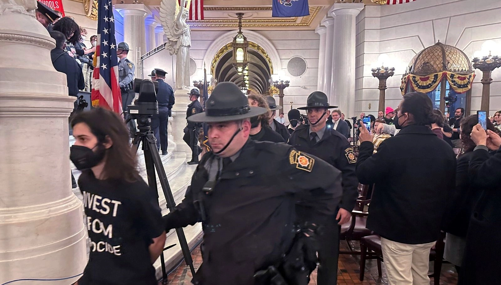 İsrail basınına göre, Pennsylvania Kongre Binası Polisini de bünyesinde barındıran Genel Hizmetler Departmanı sözcüsü, "izinsiz ve yetkisiz bir gösteri" olarak nitelendirdiği olayda, gözaltına alınanların daha sonra serbest bırakıldıklarını söyledi.Birçoğu "soykırımdan vazgeçin" yazılı tişörtler giyen protestocular, Hazine Bakanlığı'nın, İsrail tahvillerine yaptığı yatırıma tepki gösterdi. Protestocuların taşıdığı büyük bir pankartta, devletin bu vergi parasını sağlık, konut, okul ve iklim için yeniden yatırması gerektiği yazarken eylemciler, "Filistin'e özgürlük" sloganları attı.
