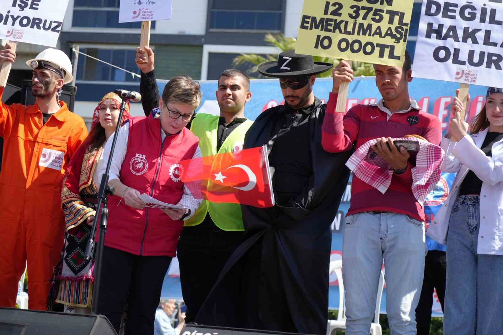 Balıesir’in Edremit ilçesinde 1 Mayıs Emek ve Dayanışma Günü düzenlenen kortej yürüyüşü ve mitingle birlikte coşkuyla kutlandı. Edremit’teki kutlamalara tiyatro oyuncusu Umut Durmaz Zoro kıyafeti ile katılarak dikkatleri çekti.