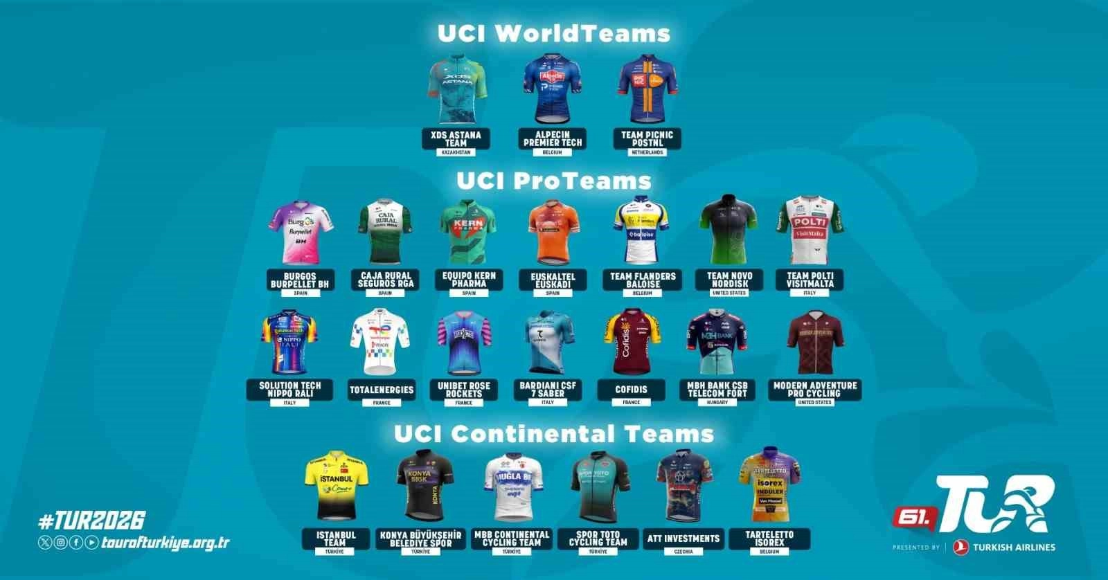 TUR 2026’da 3 WorldTeam, 14 ProTeam, 6 Continental Team kategorisinde toplam 23 UCI Takım ve 27 farklı ülkeden 161 sporcu mücadele edecek. TUR 2026’da mücadele edecek takımlar arasında Türkiye’yi temsil eden 4 Kıta Takımı yer alacak.