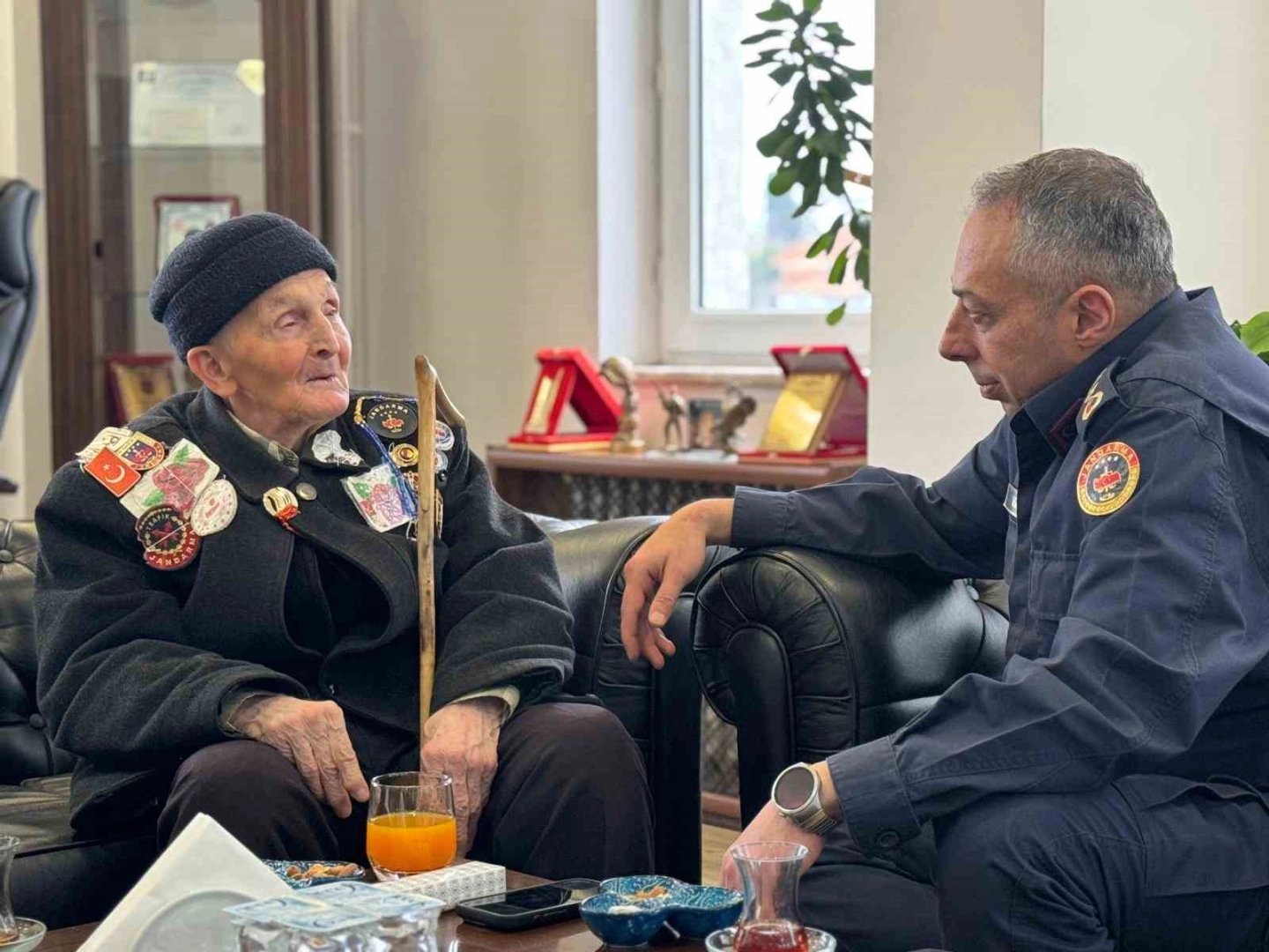 Bilecik İl Jandarma Komutanı Kıdemli Albay Ali Vanlı, 91 yaşındaki şehit babası Osman Bayır’ı kapıda karşılayıp makamında ağırladı.