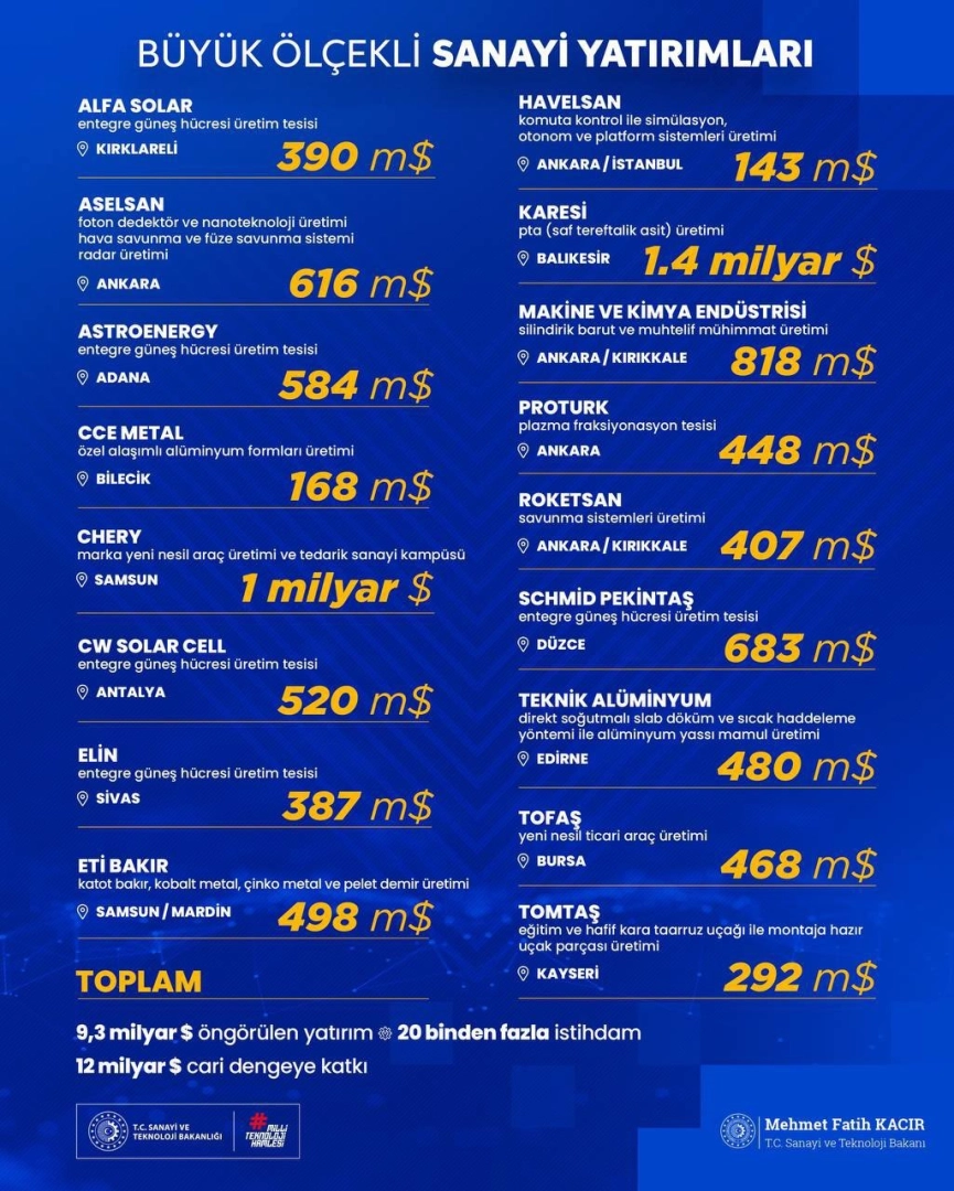 Sanayi ve Teknoloji Bakanı Mehmet Fatih Kacır, yıllık cari dengeye 12 milyar dolarlık katkı sağlayacak olan büyük ölçekli sanayi yatırımlarını paylaştı.