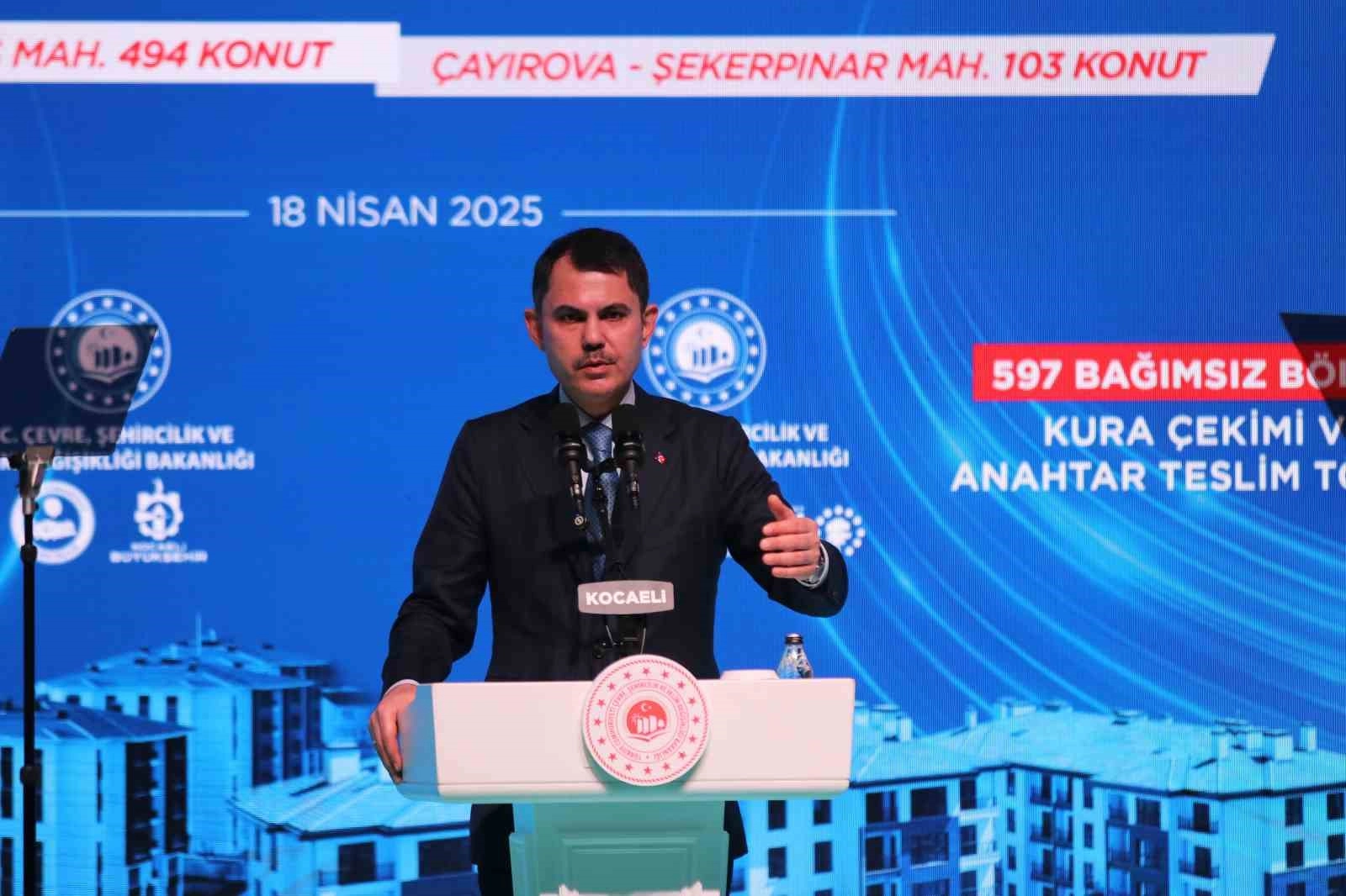 Yürütülen çalışmalarla kentin afetlere karşı hazırlıklı hale getirildiğine dikkat çeken Bakan Kurum, "Kocaeli’de 5 bine yakın konutun inşası devam ediyor. Kocaeli’ye geldiğimizde Körfez’de Barbaros Mahallesi’nde riskli alanda vatandaşımız da huzursuzdu. 315 hak sahibi vardı. Riskli alandaki kardeşlerimiz için kolları sıvadık. Derince Sopalı’da altyapısıyla, mimarisiyle Derince’ye değer katacak 584 bağımsız bölümün inşasını hızlı bir şekilde gerçekleştirdik. Bugün de bunun kurasını çekiyoruz. Emin olun, o gün iyi niyetle başlattığımız projelerde, bugün anahtarını alan, kurasını çeken o vatandaşımızın mutluluğunu görmek bizim için dünyalara bedel. Yine Şekerpınar’da yaşayan 107 hak sahibi vatandaşımız içinde aynı bölge ve mahallede, komşularıyla beraber yaşayacağı 119 bölümün inşasını bitirdik. Bugün de birazdan anahtarını teslim ediyoruz. Ne mutlu bizlere ki, sizin yüzünüze bir tebessüm düşürebiliyoruz" ifadelerini kullandı.