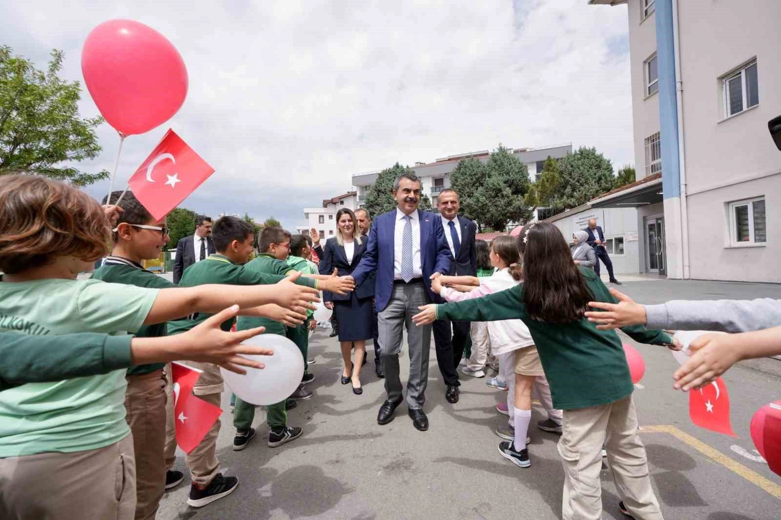 Öğretmen ve öğrencilerle bir araya gelen Bakan Tekin, okulun bayrak törenine katıldı.