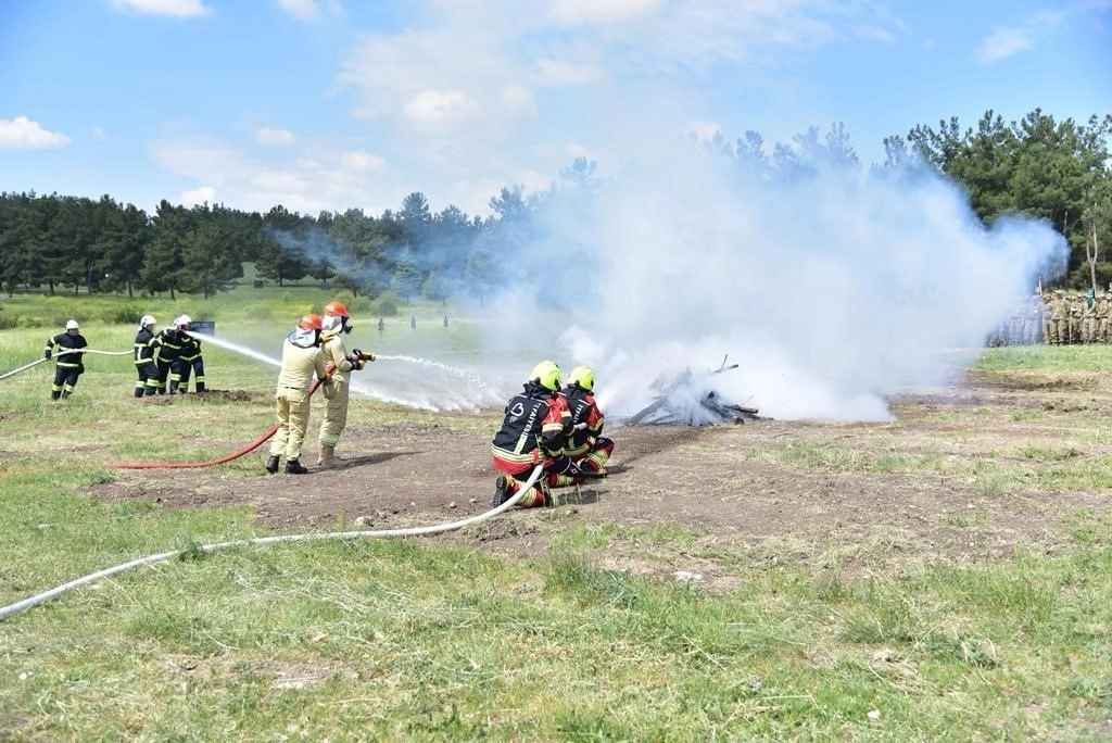 Askeri itfaiye ve Balıkesir Orman Bölge Müdürlüğü yangın ekiplerinin de katıldığı eğitimde ortak yangın söndürme tatbikatı yapıldı.