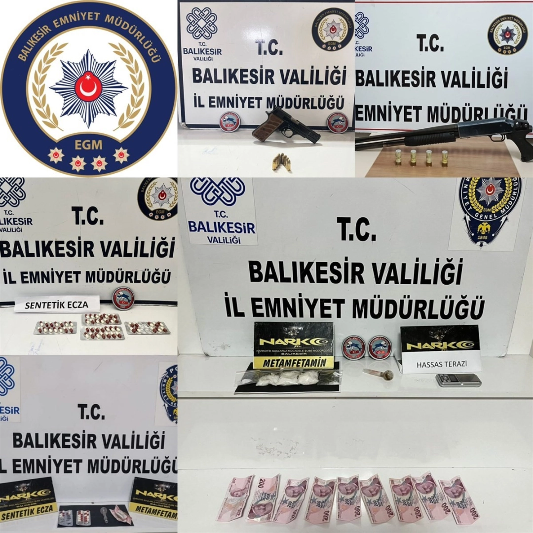 Balıkesir İl Emniyet Müdürlüğü Asayiş Şube Müdürlüğünce, son bir haftada şüpheli şahıslar ve araçlar üzerinde denetim gerçekleştirildi. Denetimlerde 11 bin 220 kişi sorgulanırken, 64 aranan şahıs yakalandı. Denetimler sonucunda; 3 ruhsatsız tabanca ve 29 fişek, 4 ruhsatsız tüfek ve 7 kartuş, bir kurusıkı tabanca ve 3 fişek, 2 bıçak, 52 adet sentetik ecza maddesi, 79,31 gram metamfetamin maddesi, 19,39 gram esrar maddesi ele geçirildi. Yakalanan şüpheliler hakkında ise gerekli işlemler yürütülüyor.