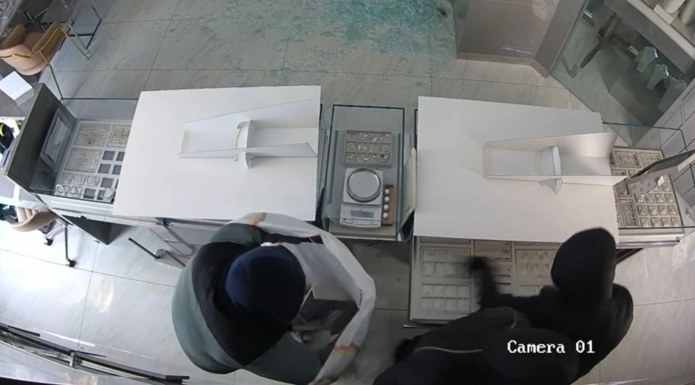 Camı kırarak içeri giren 6 kişi, yaklaşık 4 dakika içinde vitrindeki altınları çalarak kayıplara karıştı. O anlar güvenlik kamerasına saniye saniye yansıdı.