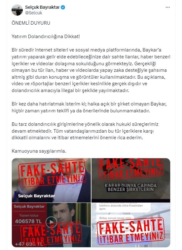 Baykar Yönetim Kurulu Başkanı Selçuk Bayraktar, sosyal medya hesabından yaptığı açıklamada, "Bir süredir internet siteleri ve sosyal medya platformlarında, Baykar’a yatırım yaparak gelir elde edebileceğinize dair sahte ilanlar, haber benzeri içerikler ve videolar dolaşıma sokulduğunu görmekteyiz. Gerçekliği olmayan bu tür ilan, haber ve videolarda yapay zaka desteğiyle şahsıma aitmiş gibi duran konuşma ve görüntüler kullanılmaktadır. Bu açıklama, video ve röportajlar benzeri içerikler kesinlikle gerçek dışıdır ve dolandırıcılık amacıyla illegal bir şekilde yayılmaktadır. Bir kez daha hatırlatmak isterim ki; halka açık bir şirket olmayan Baykar, hiçbir zaman yatırım teklifi ya da önerilerinde bulunmamaktadır. Bu tarz dolandırıcılık girişimlerine yönelik olarak hukuki süreçlerimiz devam etmektedir. Tüm vatandaşlarımızdan bu tür içeriklere karşı dikkatli olmalarını ve itibar etmemelerini önemle rica ederim" ifadelerine yer verildi.