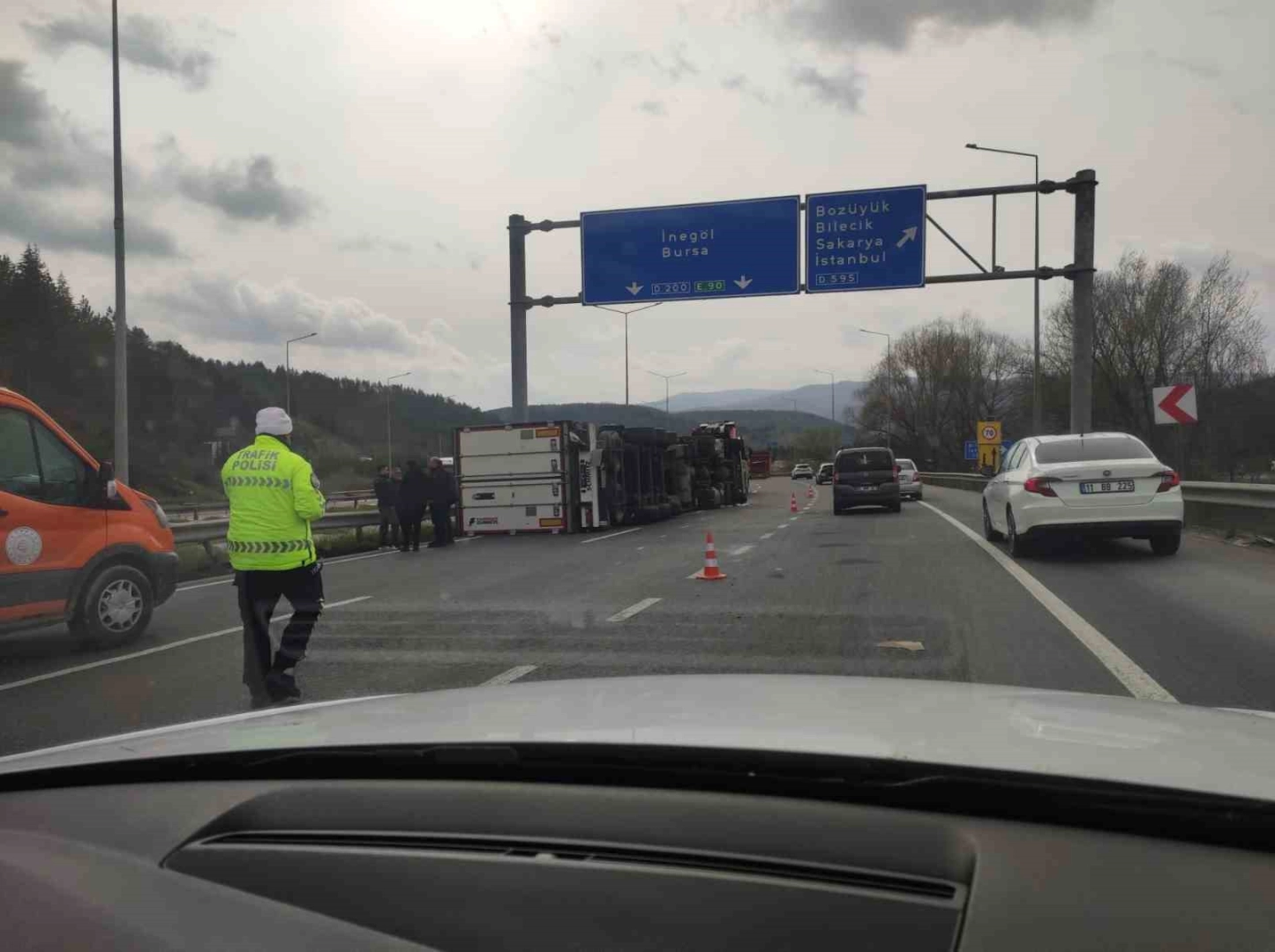 Bilecik’in Bozüyük ilçesinde kontrolden çıkan tır devrildi.