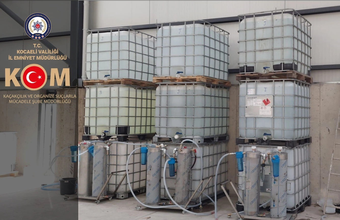 Kocaeli Emniyet Müdürlüğü Kaçakçılık ve Organize Suçlarla Mücadele Şube Müdürlüğü ekipleri Körfez ilçesinde kaçak alkol üretildiği bilgisi üzerine harekete geçti. Teknik ve fiziki takibin ardından imalathaneye operasyon düzenlendi. Yapılan aramalarda, 12 ton kaçak etil alkol, 6 ayrıştırıcı filtre ünitesi, 12 başlıklı doldurma ve paketleme ünitesi ele geçirildi. 9 şahıs hakkında 5607 S.K.M suçundan işlem yapılırken, 4 şahıs gözaltına alındı.