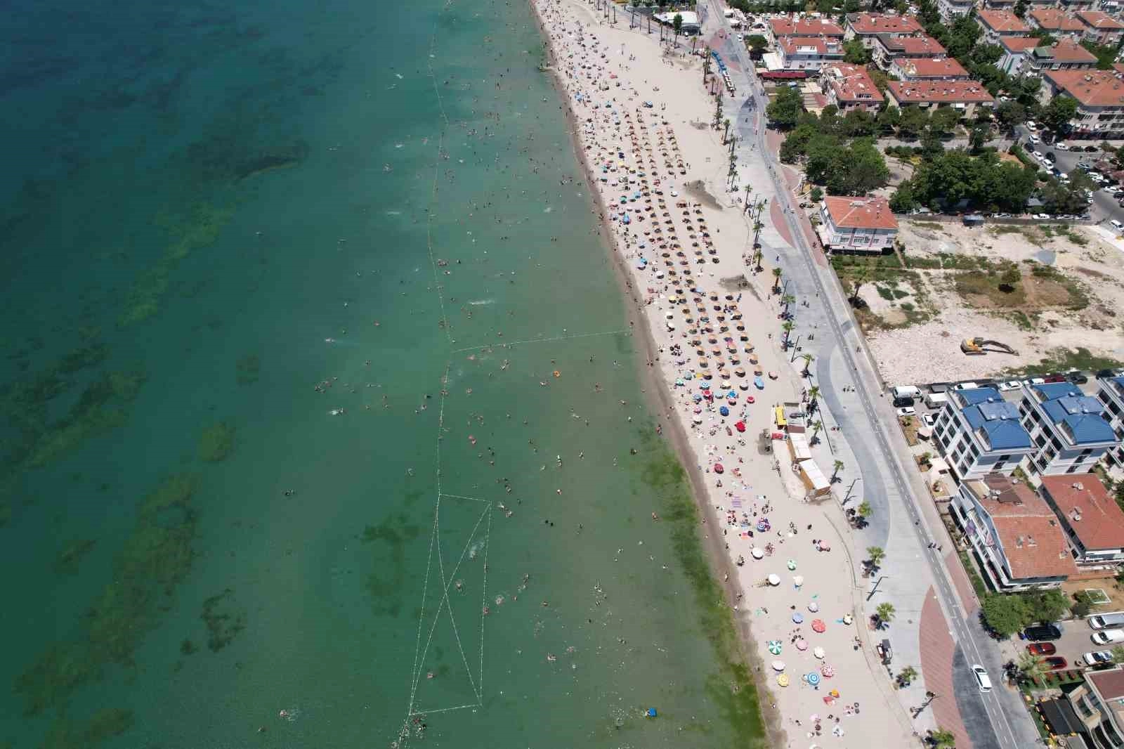 Büyükçekmece’de Kurban Bayramı’nın 3. gününde güneşli ve sıcak havayı fırsat bilen vatandaşlar sahile akın etti. Bazı vatandaşlar denize girerek serinlerken bazı vatandaşlarda güneşlenmeyi tercih ettiği sahil havadan görüntülendi.