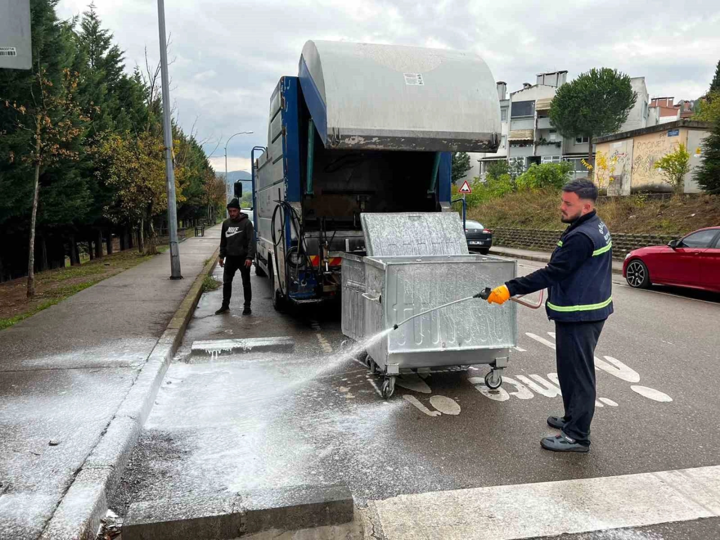 Gölcük’te ilçe genelinde bulunan çöp konteynerler, ekipler tarafından düzenli olarak yıkanarak dezenfekte ediliyor.