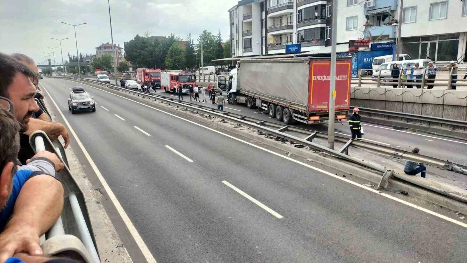 Kaza, Sakarya-Bilecik D-650 karayolu Pamukova ilçe merkezindeki alt geçitte meydana geldi. Edinilen bilgiye göre, Bilecik istikametine doğru seyir halinde olan S.K. kontrolündeki 54 AKC 023 çekici plakalı tırın ön lastiği patladı. Sürücüsünün kontrolünden çıkan tır, aynı istikamette ilerlemekte olan R.E. idaresindeki 41 TL 840 plakalı kamyonete ve bariyerlere çarptı. Meydana gelen kazada kamyonet sürücüsü R.E. yaralandı. Durumun haber verilmesi üzerine bölgeye itfaiye, polis ve sağlık ekipleri sevk edildi. Adrese ulaşan sağlık ekiplerinin müdahalesinin ardından yaralı R.E., Pamukova İlçe Devlet Hastanesi’ne kaldırıldı.
