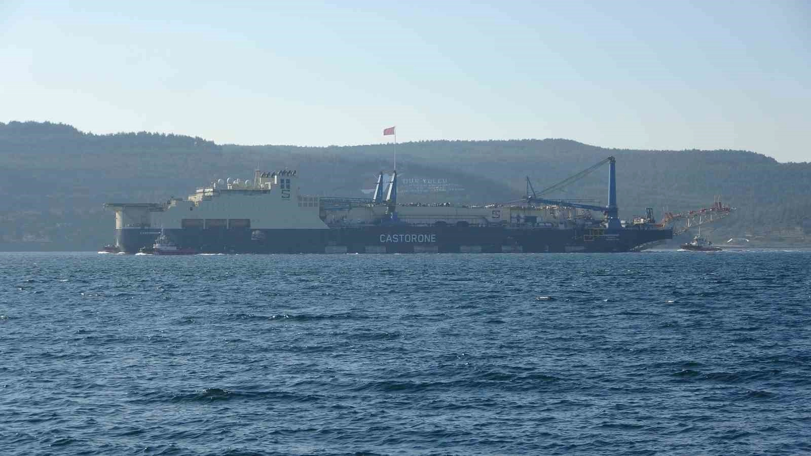 Türkiye’nin Karadeniz’de keşfettiği doğalgazı karaya ulaştıracak boruları döşeyen derin denizde boru döşeme gemisi ’Castorone’ Çanakkale Boğazı’ndan geçti.