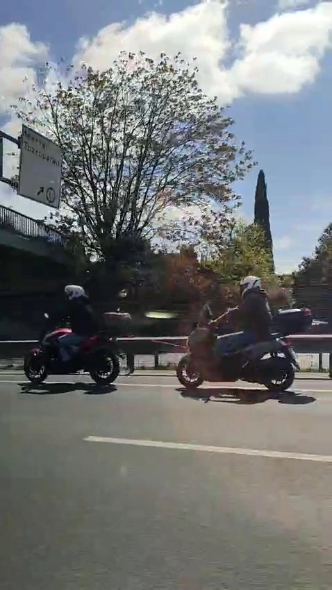 Seyir halindeki bir motosiklet diğer motosikleti iple bağlayıp trafikte ilerlediği ve tehlikeli yolculuk anları bir vatandaş tarafından cep telefonu kamerasına yansıdı.