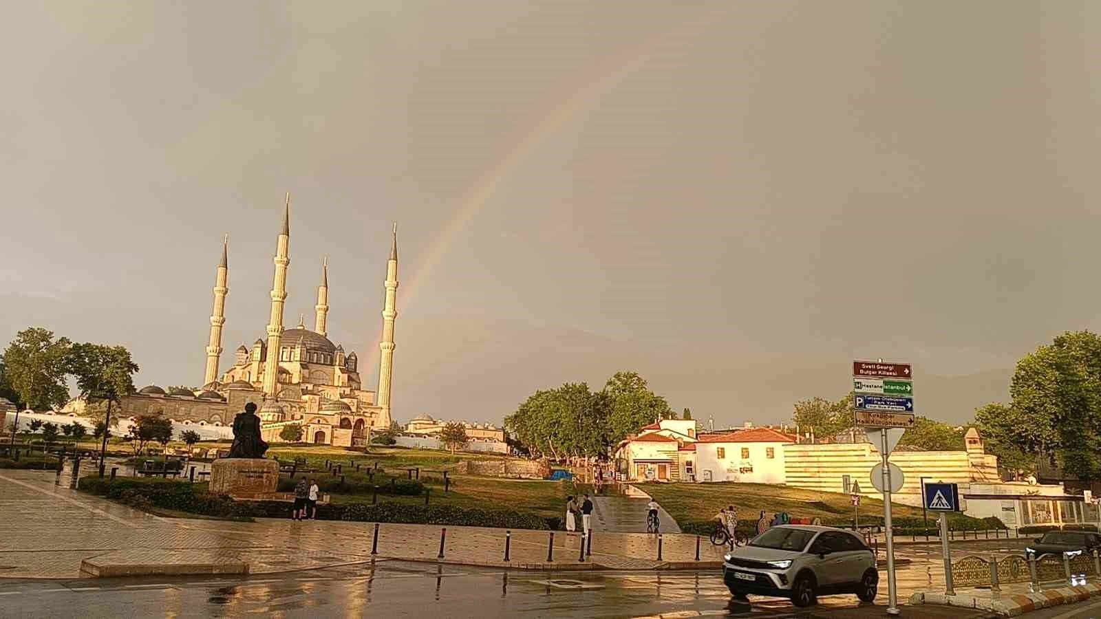 Kentin simgesi olan Selimiye’nin gölgesinde belirip pek çok noktadan izlenebilen gökkuşağı, Edirne’ye gelen misafirlere sürpriz bir doğa manzarası sundu. Vatandaşlar bu eşsiz manzarayı sosyal medyada da paylaşarak büyük beğeni topladı.