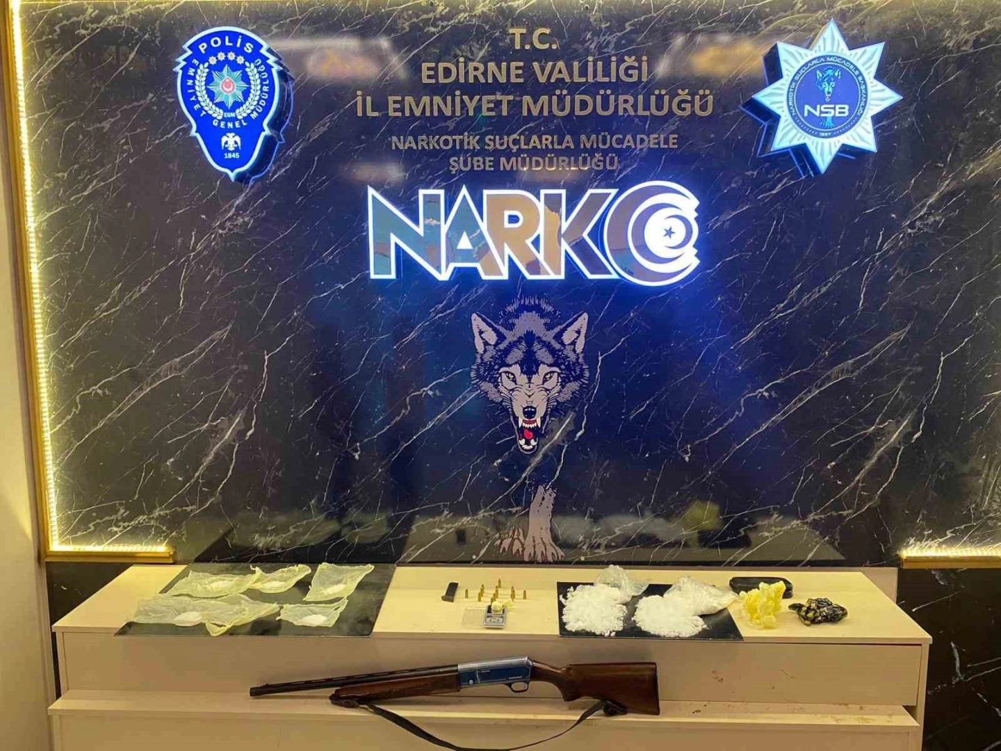 Edirne İl Emniyet Müdürlüğü Narkotik Suçlarla Mücadele Şubesi ile İstihbarat Şubesi koordinesinde M.H.Y. isimli şahsın ikametinde arama yapıldı. Yapılan aramada 8 parça halinde 823 gram metamfetamin, 1 hassas terazi ve 1 av tüfeği ele geçirildi. Olayla ilgili 2 şahıs gözaltına alındı. İşlemlerin ardından adliyeye sevk edilen B.B. isimli kadın adli kontrolle serbest bırakılırken, M.H.Y. ise çıkarıldığı mahkemece tutuklandı.