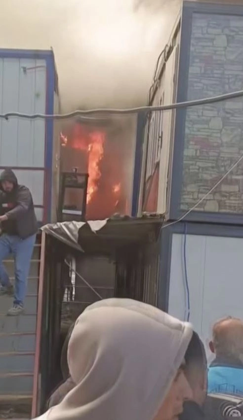 Alevlerin sardığı konteynerden can havliyle kaçan işçilerin panik anları kameraya yansıdı.