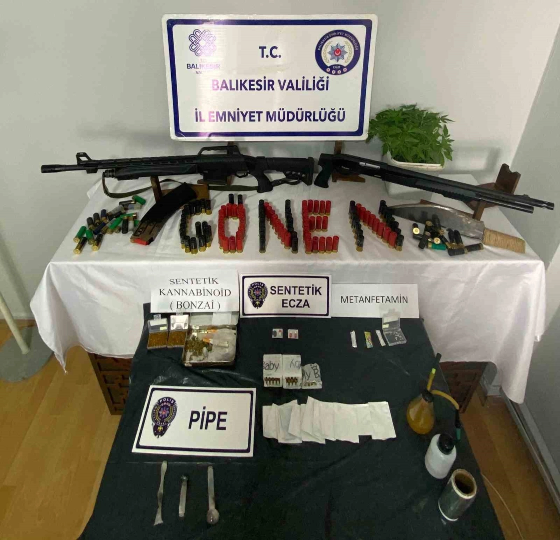 Balıkesir’in Gönen ilçesinde polis ekipleri tarafından düzenlenen operasyonda uyuşturucu madde, ruhsatsız silahlar ve çeşitli malzemeler ele geçirildi.