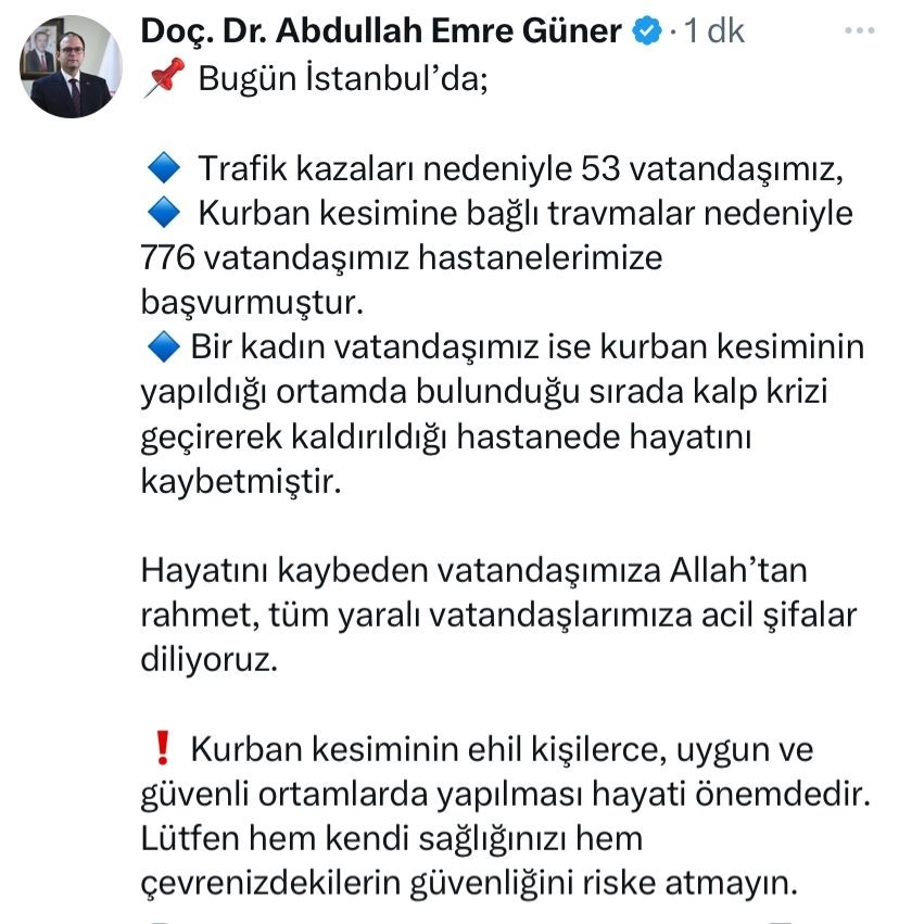 Dr. Abdullah Emre Güner, sosyal medya hesabından yaptığı açıklamada, "Bugün İstanbul’da trafik kazaları nedeniyle 53 vatandaşımız, kurban kesimine bağlı travmalar nedeniyle 776 vatandaşımız hastanelerimize başvurmuştur. Bir kadın vatandaşımız ise kurban kesiminin yapıldığı ortamda bulunduğu sırada kalp krizi geçirerek kaldırıldığı hastanede hayatını kaybetmiştir. Hayatını kaybeden vatandaşımıza Allah’tan rahmet, tüm yaralı vatandaşlarımıza acil şifalar diliyoruz. Kurban kesiminin ehil kişilerce, uygun ve güvenli ortamlarda yapılması hayati önemdedir. Lütfen hem kendi sağlığınızı hem çevrenizdekilerin güvenliğini riske atmayın" ifadelerini kullandı.