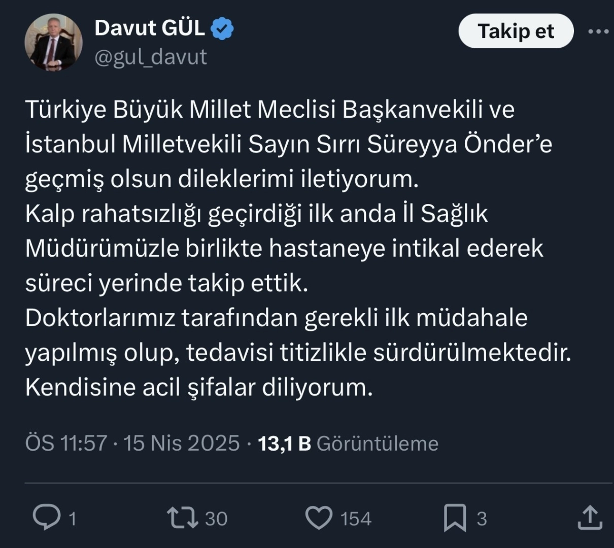 "Türkiye Büyük Millet Meclisi Başkanvekili ve İstanbul Milletvekili Sayın Sırrı Süreyya Önder’e geçmiş olsun dileklerimi iletiyorum. Kalp rahatsızlığı geçirdiği ilk anda İl Sağlık Müdürümüzle birlikte hastaneye intikal ederek süreci yerinde takip ettik. Doktorlarımız tarafından gerekli ilk müdahale yapılmış olup, tedavisi titizlikle sürdürülmektedir.