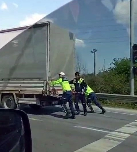 Ekipler, yolda arızalanan kamyoneti iterek sürücüye yardım etti.