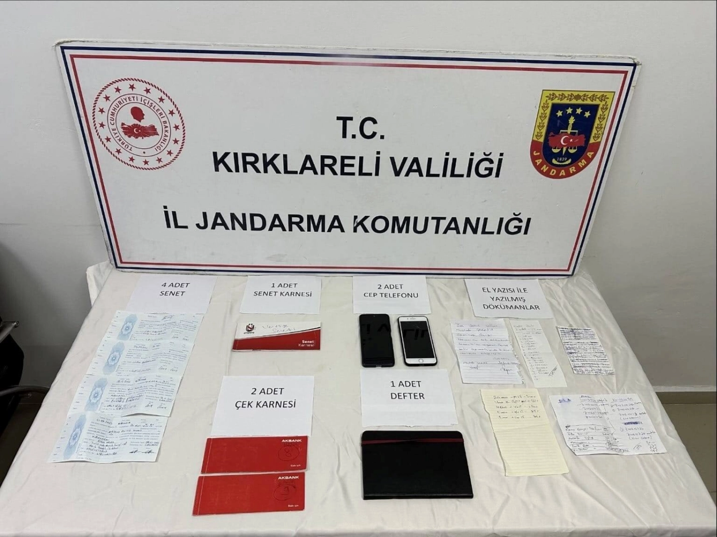 Düzenlenen operasyonda 4 adet dolu senet, 1 adet borçluların isimlerinin yazılı olduğu ajanda, 2 adet cep telefonu ve çeşitli dokümanlar ele geçirildi.