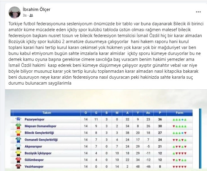 Bilecik 1. Amatör Lig B Grubu’ndan mücadele eden ve lig sonunda Gülübespor ile 12’şer puanı paylaşarak 2. Amatör Lig düşen İçköyspor Başkanı İbrahim Ölçer tepki gösterdi. Ölçer, sosyal medya üzerinde yaptığı açıklamada, "Türkiye Futbol Federasyonuna sesleniyorum. Önümüzde bir tablo var buna dayanarak Bilecik 1. Amatör Lig’de mücadele eden İçköyspor Kulübü tabloda üstün olması rağmen maalesef Bilecik ASKF Başkanı Nusret Tosun ve Futbol İl Temsilcisi İsmail Özdil hiç bir karar almadan bizi Bilecik 2. Amatör Lig’e düşürmeye çalışıyorlar. Hani hakem raporu, hani kurul toplantı kararı, hani tertip kurul kararı. Bugün sahte imzalarla karar almışlar ve İçköyspor’u kümeye duruyorlar. Gerekirse CİMER’e, Cumhuriyet Savcılığına başvuru yapacağım. Futbol İl Temsilcisi İsmail Özdil benim hakkımı gasp ederek beni kümeye düşürmeye çalışıyor. Ayıptır günahtır bu vebali kim ödeyecek. Hiç bir karar almadan nasıl kitapçıklara bakarak beni küme düşüyorsunuz" dedi.