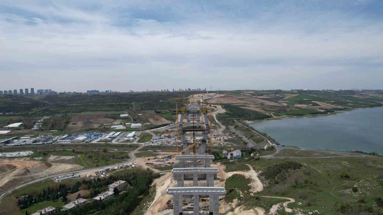 Köprü ve otoyol şantiyesinde dron ile çekilen görüntülerde köprü direklerinin 100 metre yüksekliğe ulaştığı ve üzerindeki yoğun çalışmalarının devam ettiği görüldü.